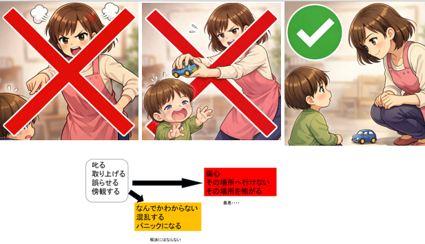 安心させる。ことばがでないのであれば、言葉にしてあげることが重要です。